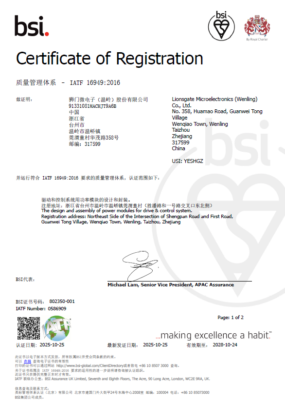 狮门微电子通过 IATF 16949 汽车质量管理体系认证