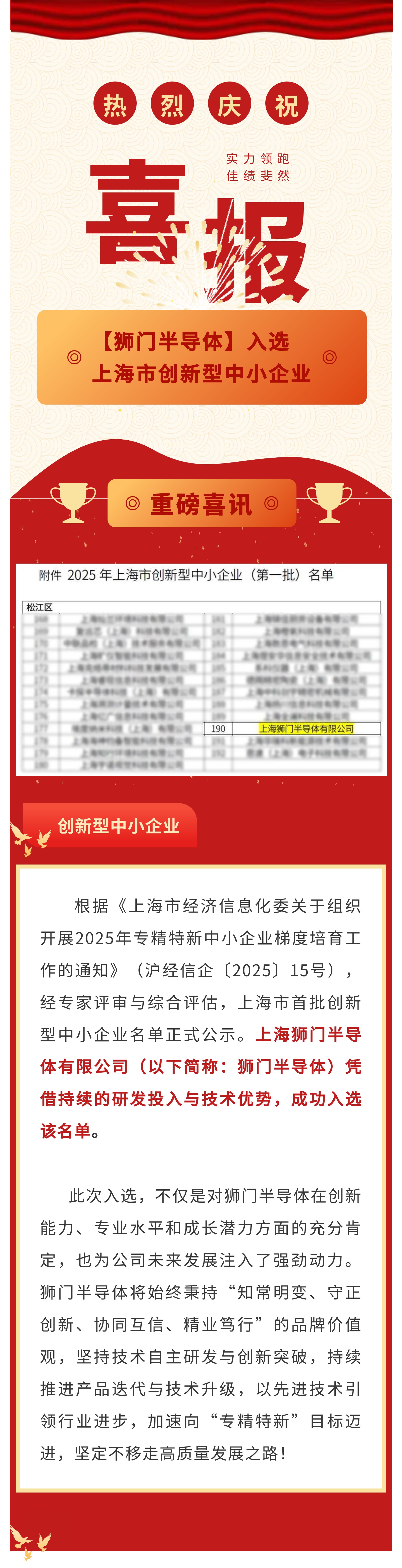 喜报 | 【狮门半导体】成功入选2025年上海市创新型中小企业名单