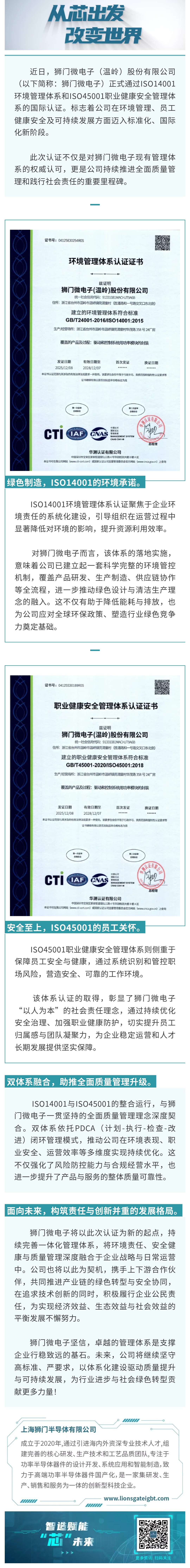 喜报 | 双认证!【狮门微电子】同步通过ISO14001及ISO45001国际管理体系认证!