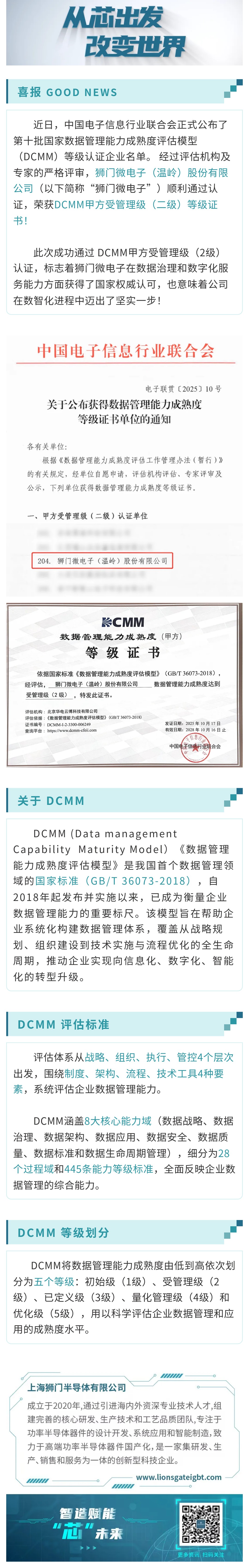 喜报 |【狮门微电子】荣获 DCMM(数据管理能力成熟度评估模型)二级认证!